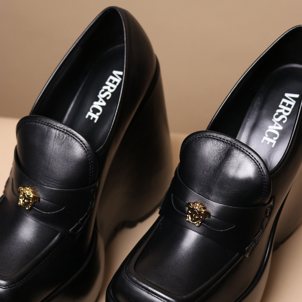Crafted from premium black leather, these heels exude refinement and versatility. The sleek silhouette design elongates the legs, while the iconic Versace gold-tone hardware embellishment adds a touch of opulence to every step.
