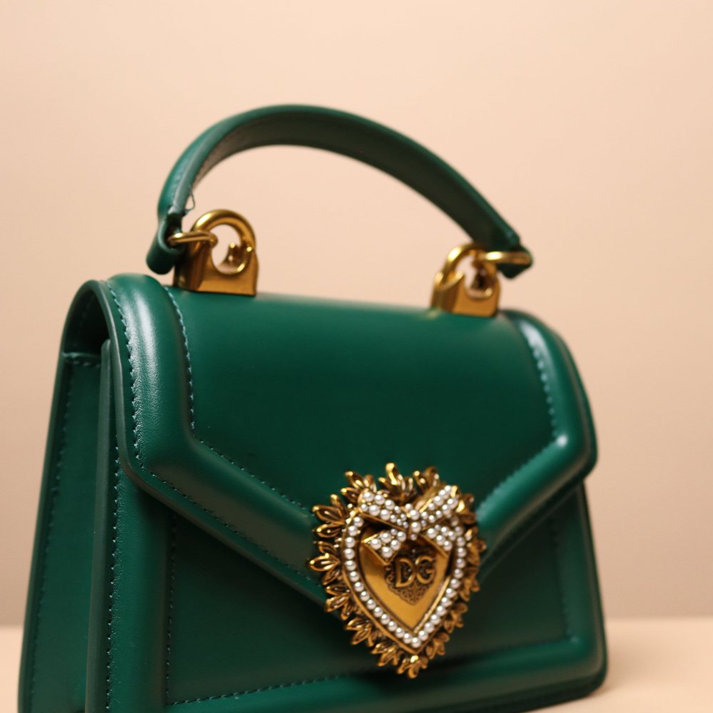 Impeccably designed by renowned fashion house DG, this compact yet versatile bag exudes sophistication from every angle. The lush green leather exterior not only adds a touch of opulence but also ensures durability, promising years of use without sacrificing style.